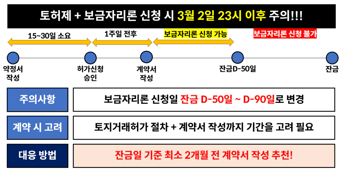 쉽게 설명 드리면 3월 2일 23시 이후 신청하는 보금자리론은 대출 예정일 50일 이전에는 신청을 해야 대출이 가능해 집니다. 만약 이전처럼 30일 이전에 해도 되는 줄 알고 신청했다가 낭패를 볼 수 있습니다.
