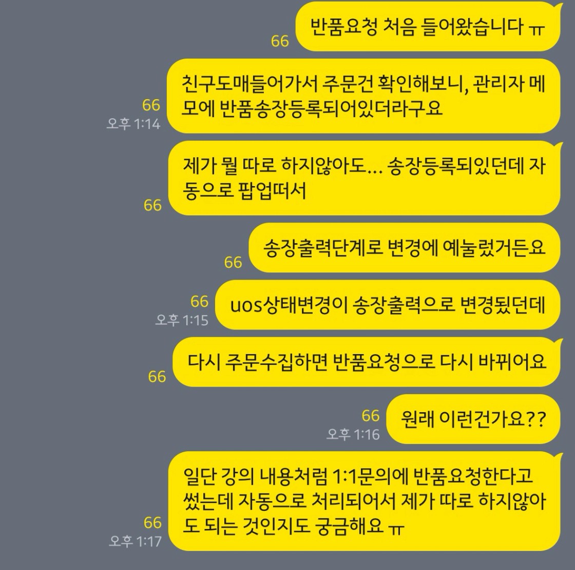 이미 제가 1:1 요청하기전에 친구도매측에서 자동으로 처리하는 것 같던데 그럴 땐 따로 1:1 요청 안넣어도 상관없는 걸까요? 그리고서 반품완료되면 그때 uos전산처리하면 되는 건가요? 너무 어렵네요…