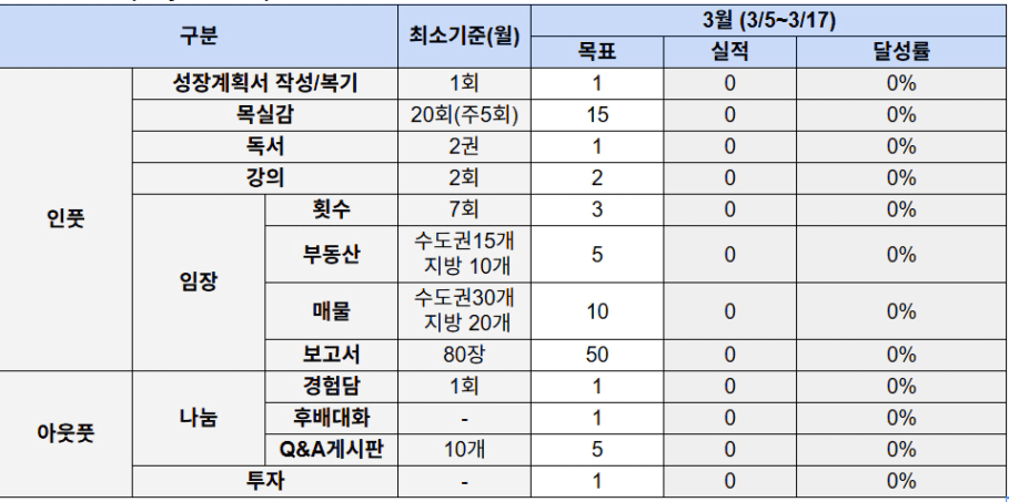 → 임장과 부동산/매물 목표는 1.5배 이상 높게 달성한 상황이다. 주말 뿐만 아니라 평일에도 거의 퇴근하고 저녁마다 매물임장을 진행하였으므로, (매물털기 진행) 목표보다 150~200% 높게 목표를 달성하였다. (이 부분은 칭찬한다!)