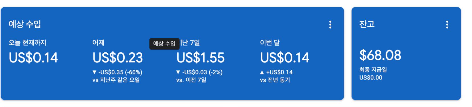 하나는 광고 제한이 걸리는 바람의 근 한달을 놓고 있었더니 수익이 거의 없네요