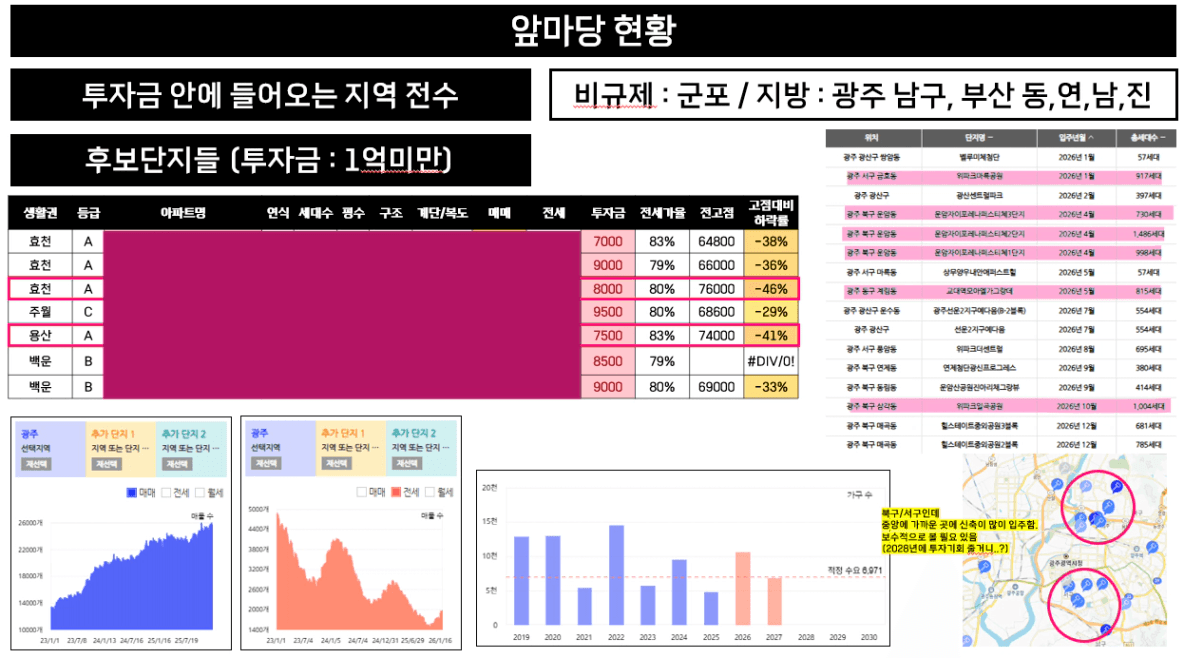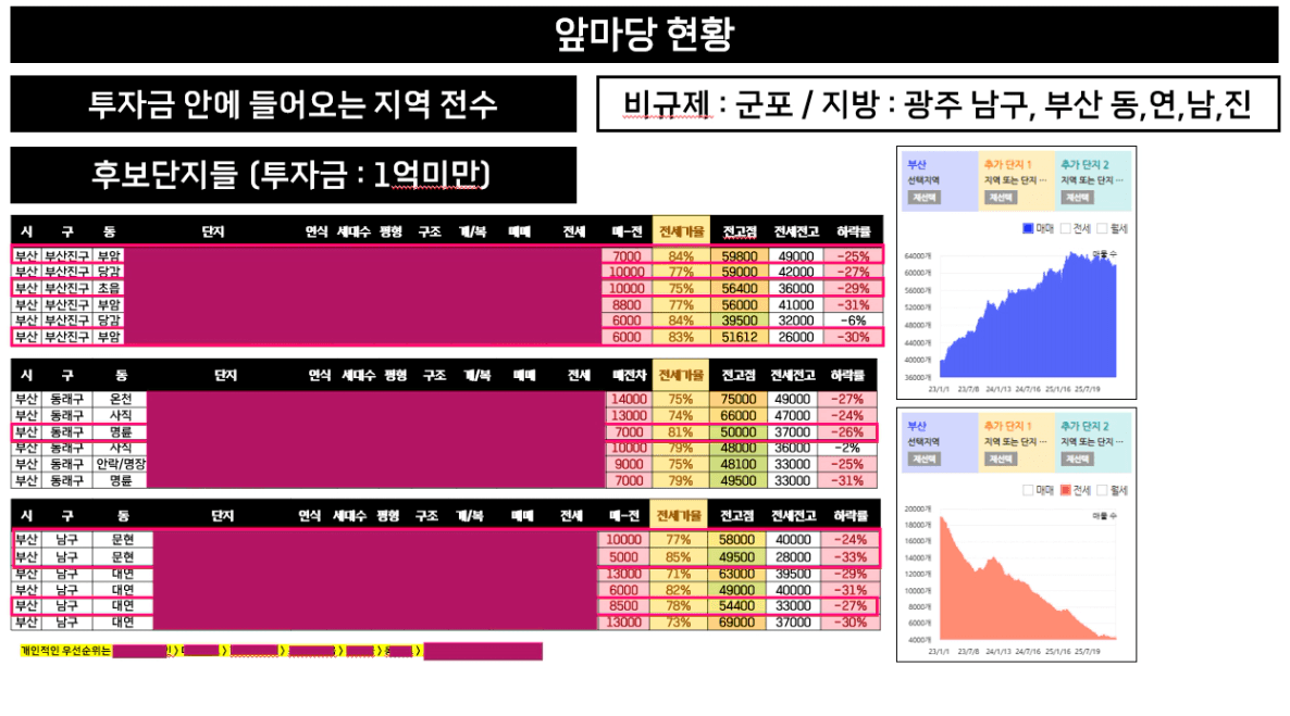 해당 앞마당에서 “투자금 시나리오에 맞 는 지역”을 추리고 그 지역은 모든 단지들을 전수조사 합니다.