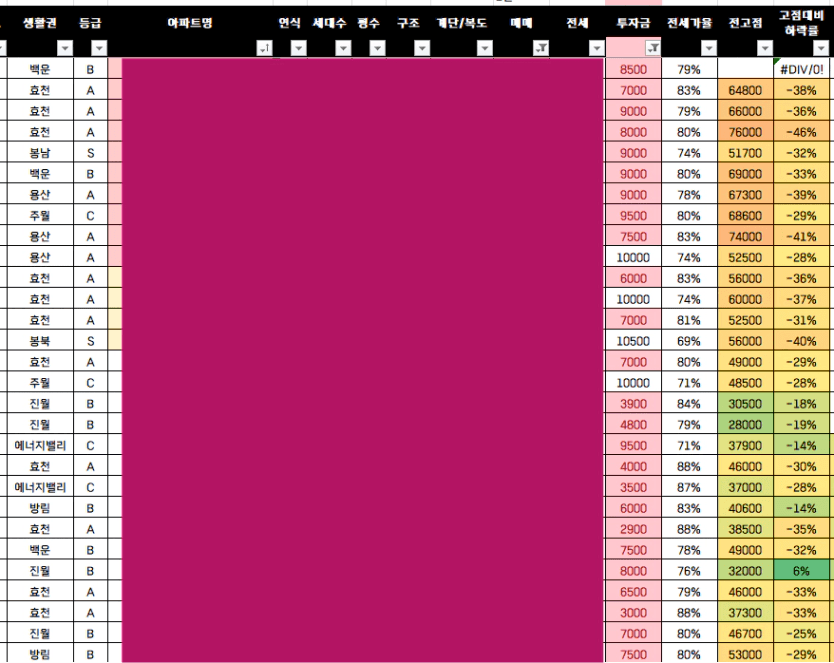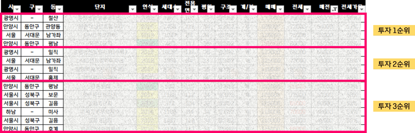 매매가별 or 투자금 (본인 시나리오에 맞는)별로 나열한 후 투자 우선순위를 세웁니다.