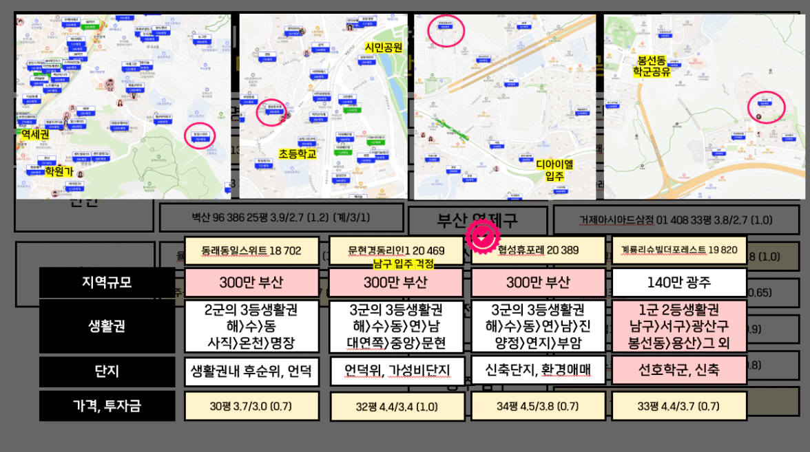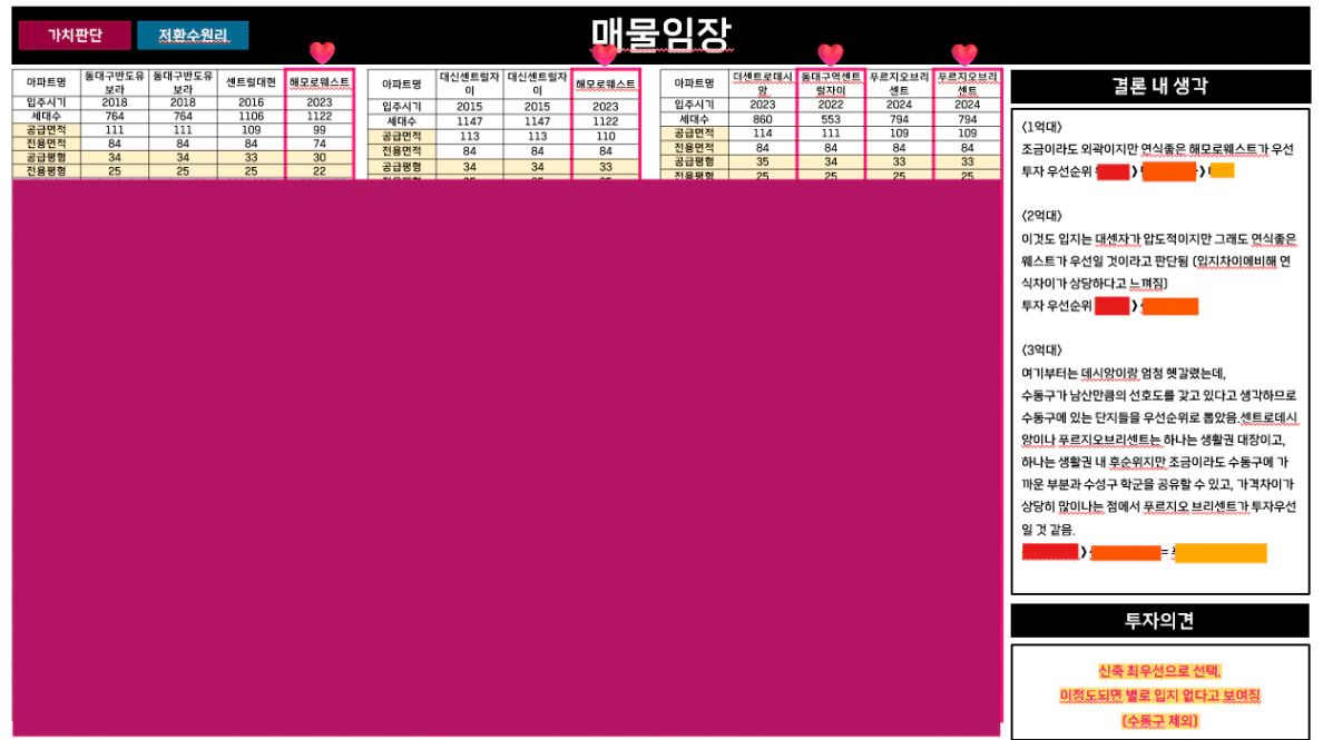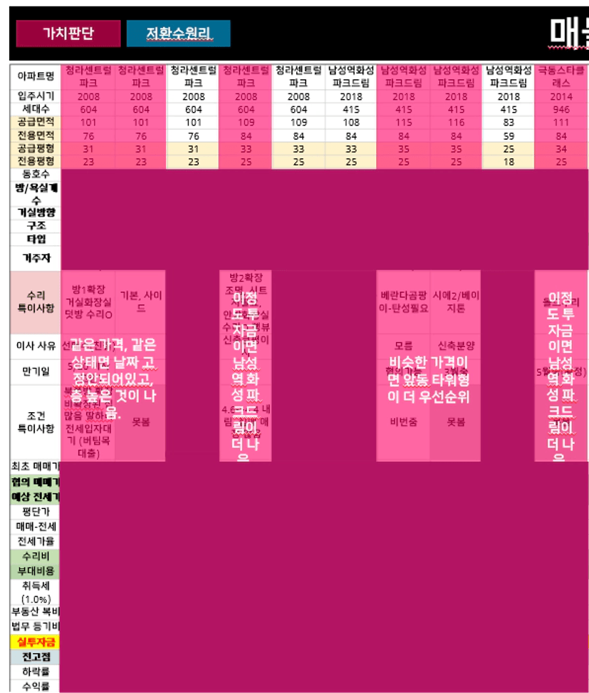 그리고 본 매물들을 다음과 같이 정리합니다.