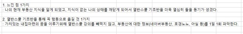 : 나의 현재 부동산 지식을 알게 되었고, 지식이 없는 나의 상태를 깨닫게 되어서 열반스쿨 기초반을 더욱 열심히 들을 동기가 생겼다.