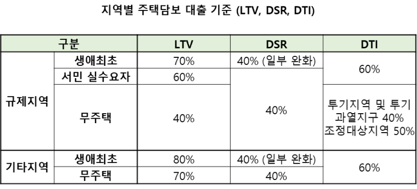 | 구분 | 규제지역 (서울 전역, 경기도 일부) | 비규제지역(지방 등) |