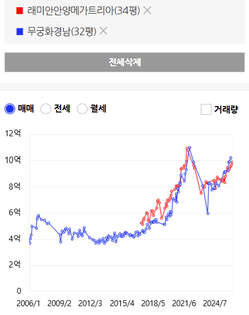 신축인 메가트리아의 가격이 항상 더 먼저, 높이 오르다가