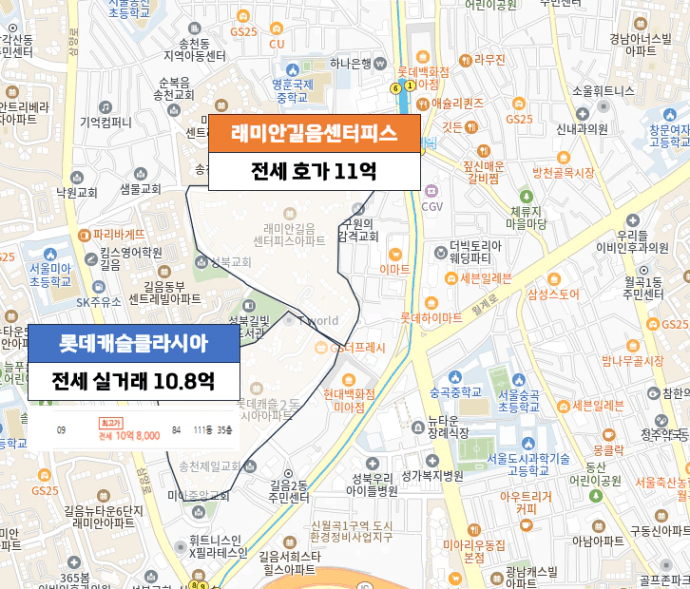 이전의 실거래보다는 높은 가격이라 실제 거래까지 연결될 지 지켜봐야겠지만, 바로 래미안길음센터피스 옆에 위치한 롯데캐슬클라시아에서 10.8억 원에 거래가 된 걸 보면 아예 불가능한 가격은 아니라고 생각합니다.