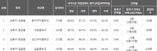 성북구에는 학업성취도가 85%가 넘는 학군이 괜찮다고 볼 수 있는 중학교가 4개가 있습니다. 이 중 길음중학교는 특목고 진학률이 높은 것으로 유명한데요.