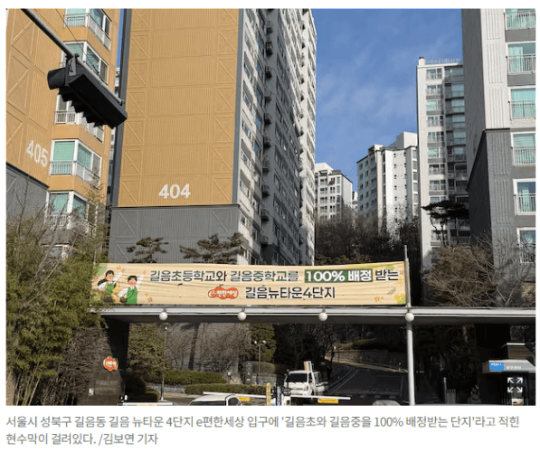 길음뉴타운 4단지 입구에는 길음중과 길음초를 배정받을 수 있다는 현수막이 걸려있기도 합니다.