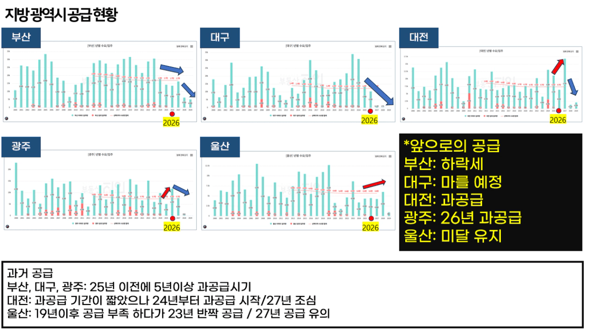 울산 상승 이후, 부산이 반응 중이며, 그다음 흐름이 대구와 대전으로 이어질 가능성도 조심스럽게 느껴졌습니다. 이런 시기일수록 더 중요하게 봐야 할 것은 공급 물량 감소와 전세 소진 속도입니다.