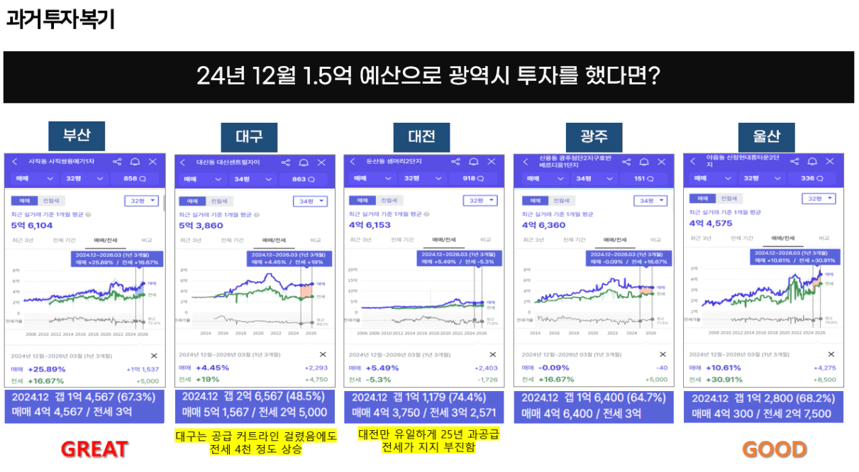그래서, 광역시 상황에 대해서 정리를 해봤습니다. 현재 지방 시장은 어디쯤 와 있는지, 그리고 지금이 왜 의미 있는 시점인지. 저도 올해 광역시 1채 투자를 목표로 하고 있기 때문에 데이터와 현장을 기반으로 다시 점검해 보려 합니다.
