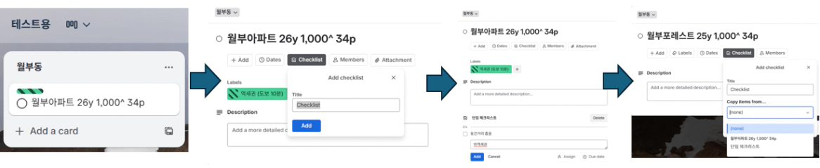 다음으로는 트렐로 체크리스트 활용법입니다. 체크리스트도 위에 전달드린 가이드를 바탕으로 차근차근 따라해보시면 되는데요. 체크리스트는 보통 단점을 작성할 때 많이 활용합니다. 체크리스트에 동간거리좁음, 비역세권 등을 기록해두고 체크체크해나가며 쌓아가면 나중에 아파트 단지 카드를 눌렀을 때 한번에 확인이 가능합니다. 단지 카드를 누르고, Checklist를 누르시고, 하단에 생성된 체크리스트 항목을 하나씩 추가합니다. 이걸 재차 활용하려면 처음에 체크리스트 하나를 만들어두면 다른 단지 카드에도 체크리스트를 또 눌러서 활용이 가능합니다.