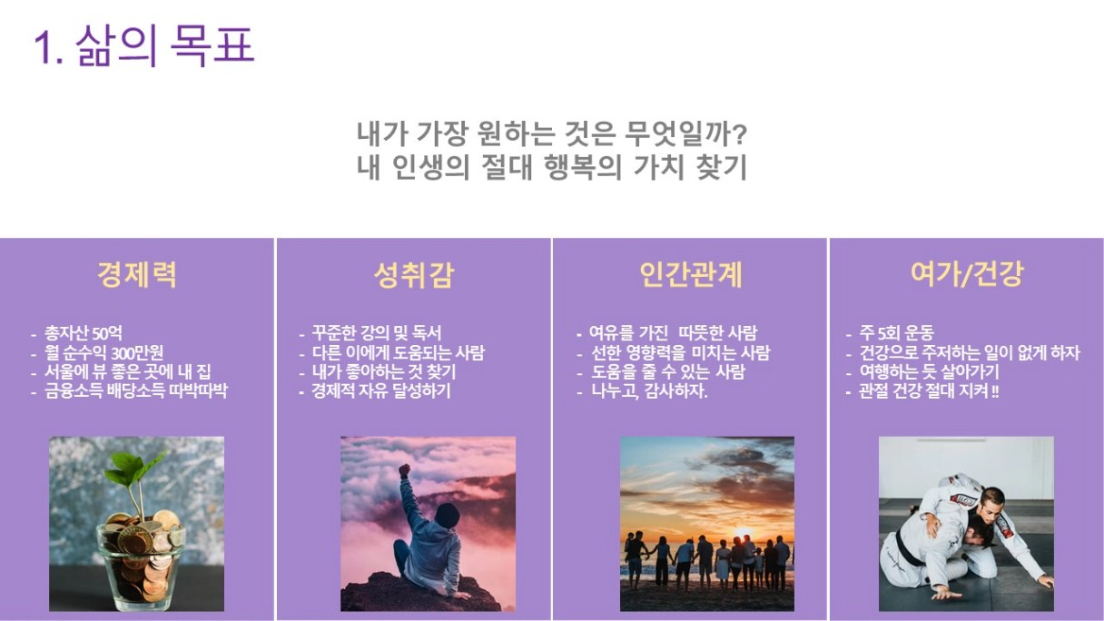 - 인간관계: 주1회 동료에게 안부 묻기, 월1회 가족들과 나들이