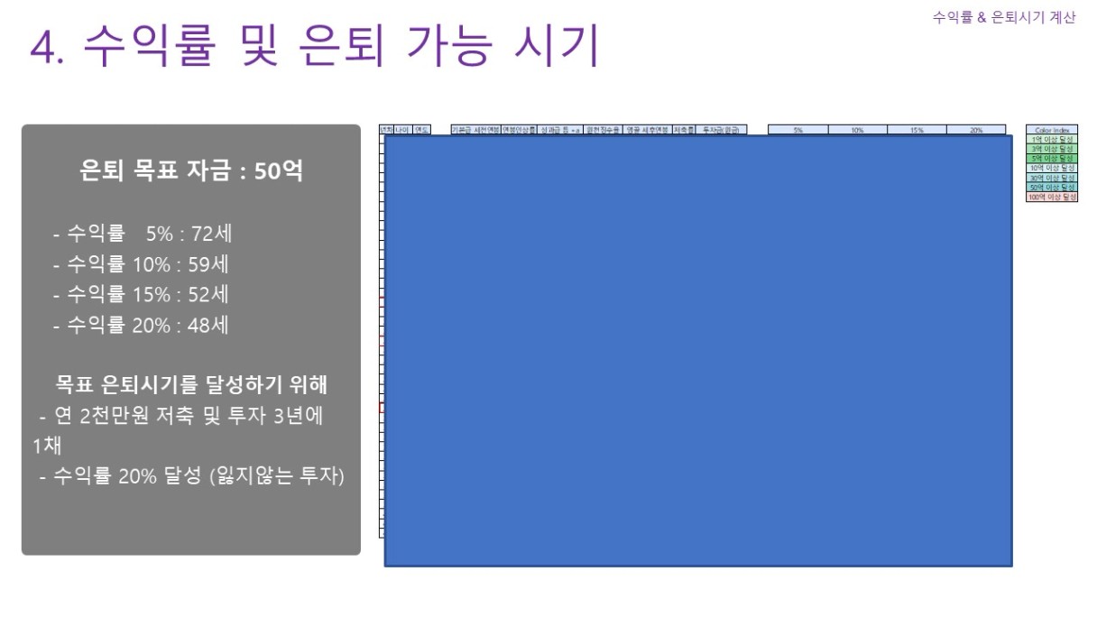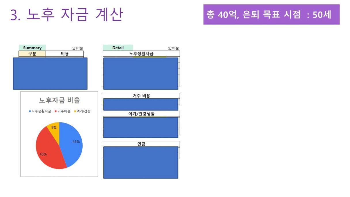 노후자산 40억에 여유금 10억 해서 목표금액 50억!