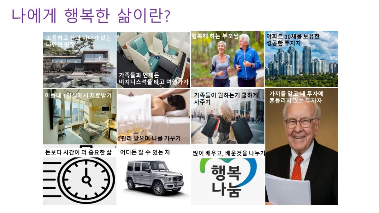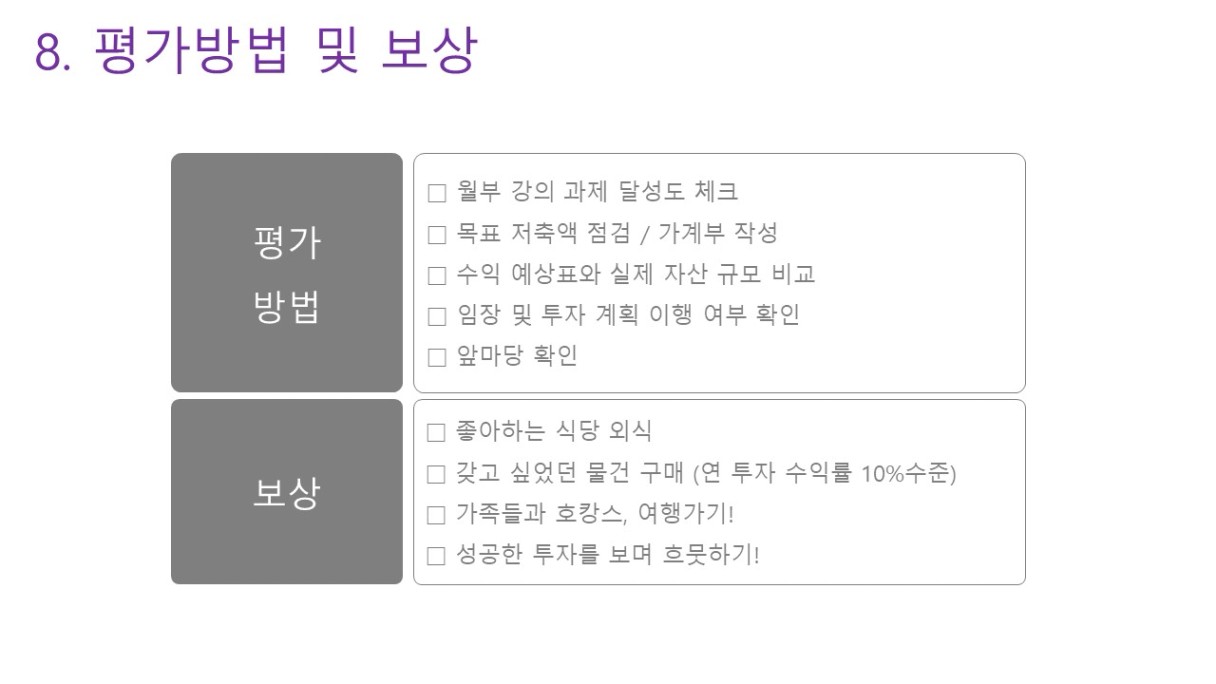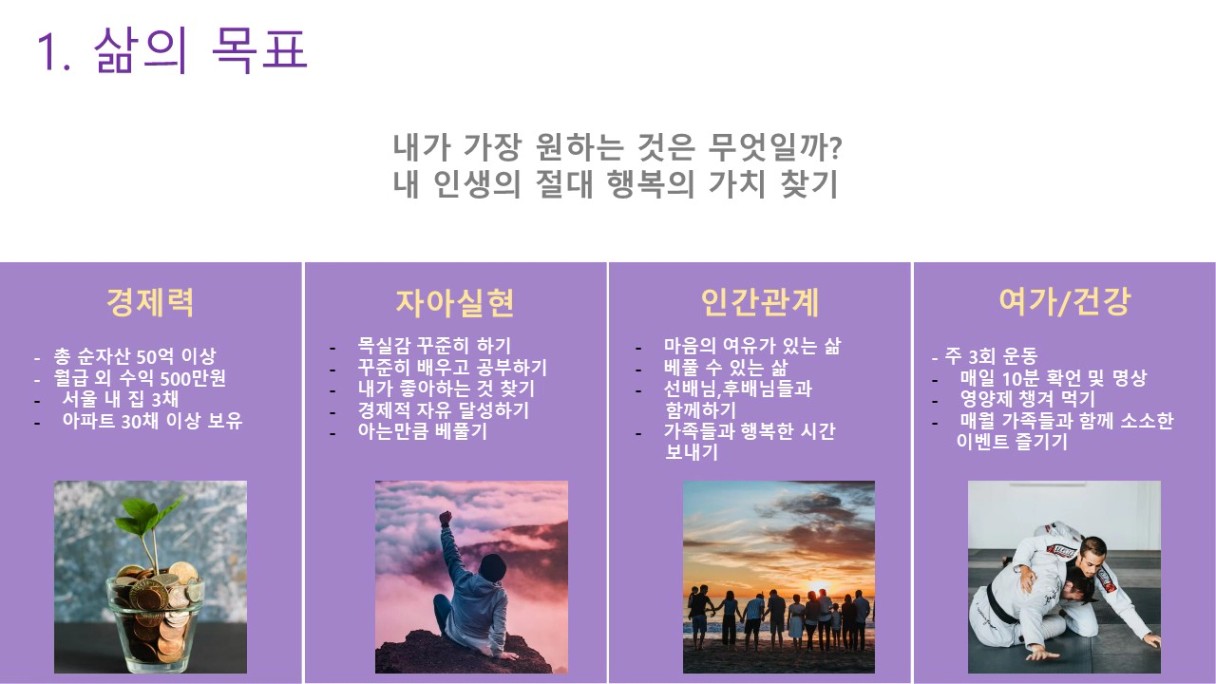 - 인간관계: 월부 동료분들께 하루1회 이상 칭찬/응원드리기! 가족들과 행복한 시간 보내기
