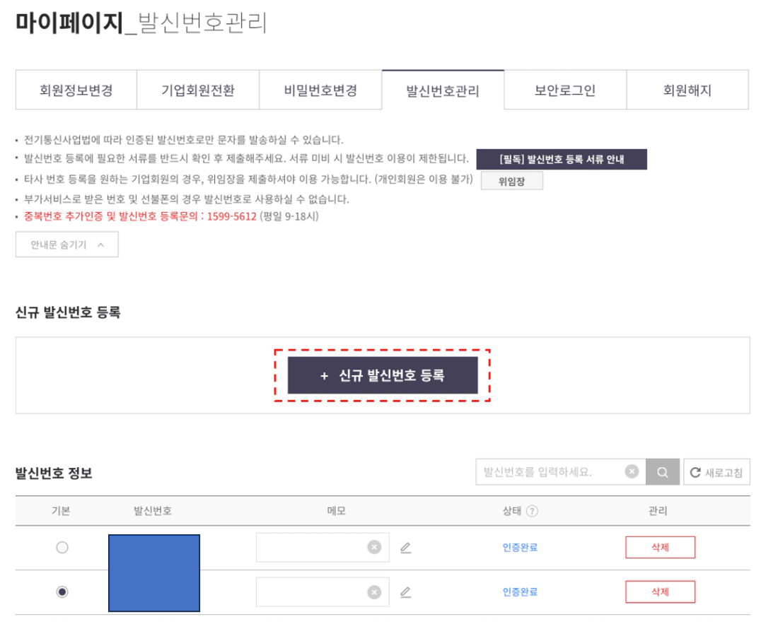 마이페이지 - 발신번호 관리에서 2번에서 만든 번호 또는 본인의 휴대전화 번호를 등록합니다.