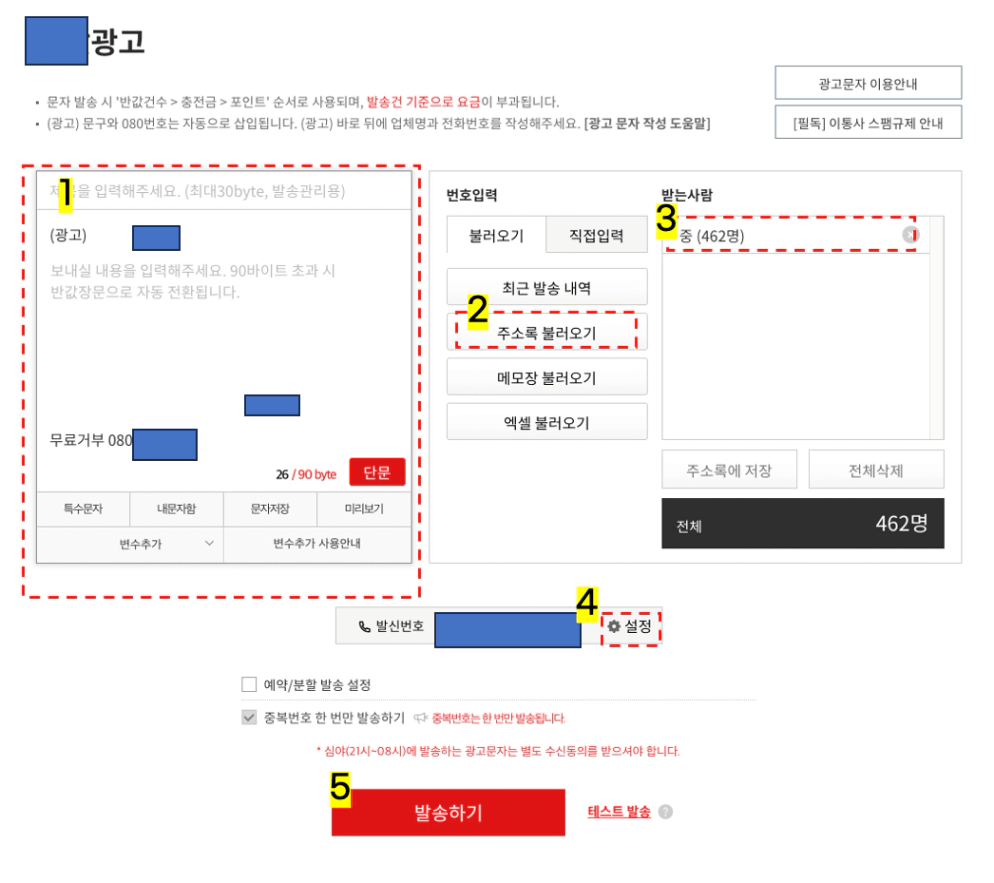 4. 발신 번호는 위에서 등록했던 번호로 설정해주시고