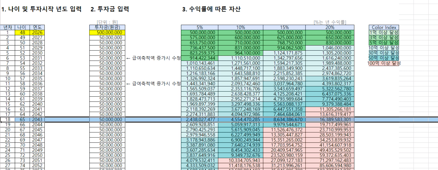 목표 금액 31.1억 (현재 나이 48세, 연저축액 5000만원에서 시작)