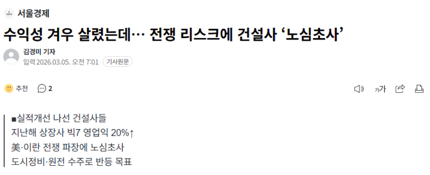 지난 달 28일 미국과 이스라엘의 전격적인 이란 공습으로 중동 전쟁이 발발하면서 체질 개선을 통해 어렵사리 수익성을 확보해놓은 건설업계의 셈법이 다시 복잡해졌다. 이란이 세계 에너지 공급의 핵심 통로인 호르무즈 해협을 봉쇄하면서 국제유가와 해상운임이 크게 오르고 있어서다. 국제유가와 해상운임은 아스팔트와 시멘트, 철강 등 주요 건설자재의 생산·운송 원가에 크게 영향을 미치는 요소다. 한국건설산업연구원에 따르면 유가가 60% 상승할 경우 건축물 생산비용이 1.5%, 일반 토목시설 생산비용이 3%까지 증가한다.