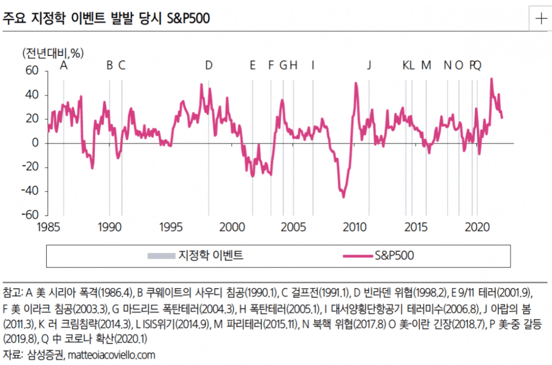 대표적으로 S&P500도 지정학 이벤트가 발생할때마다 조금씩 하락하는 경향을 보이고 있습니다.