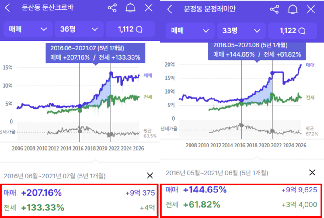 대전광역시 구축 대장단지인 둔산 크로바는 과거 비슷한 상승시기에 수도권 1급지 송파 못지 않은 수익을 보였고, 실제로 수익률은 더 높았습니다.