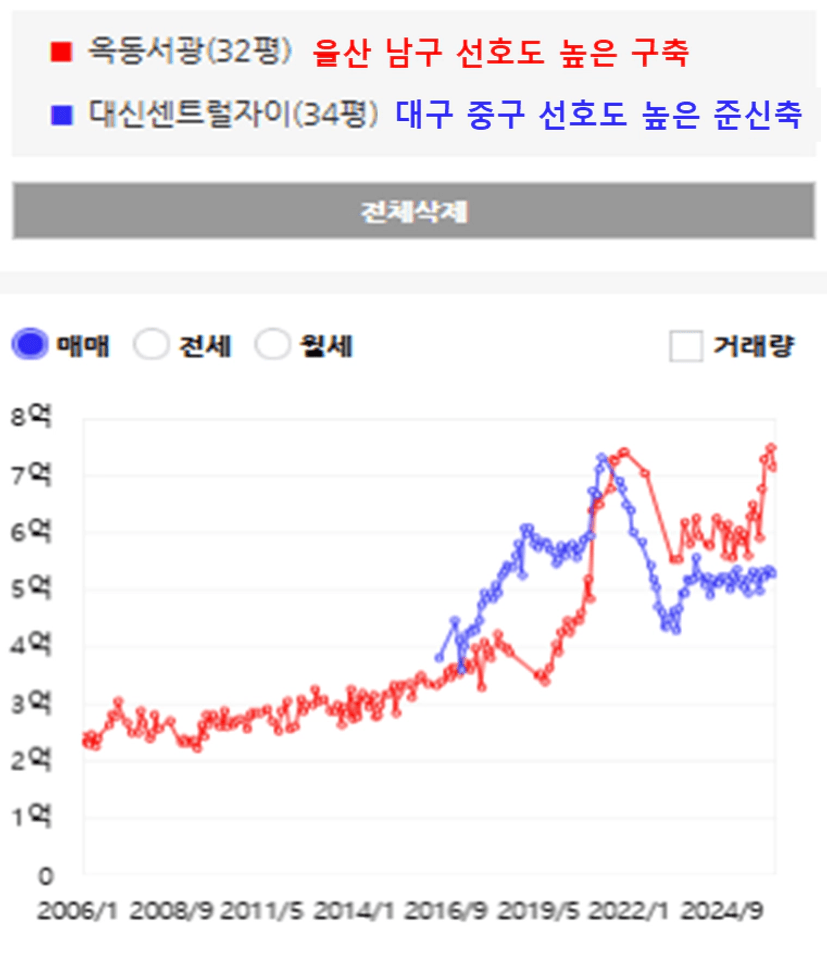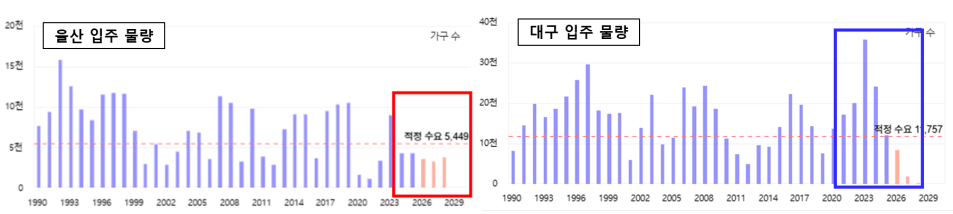 실제로 입주가 많았던 대구 지역은 입주가 부족했던 울산에 비해 아직 가격 회복이 더딘 모습을 보입니다.