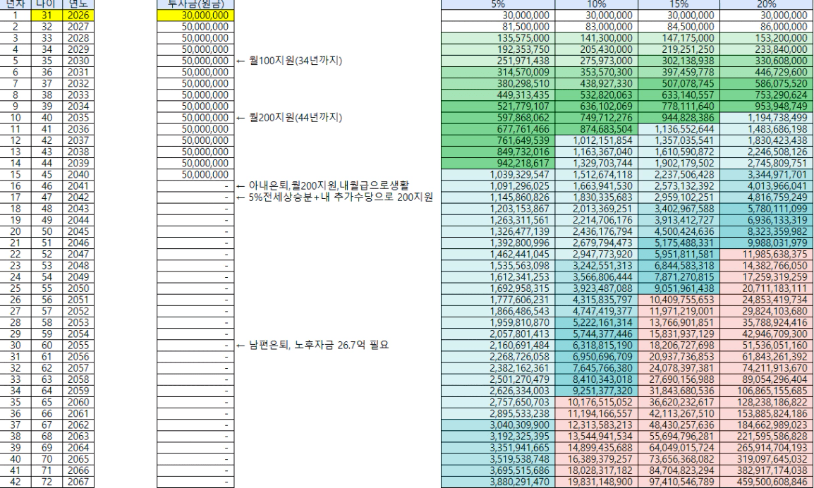 - 순자산 20~26.7억 목표노후자금 세팅. 안되더라도 정년퇴직 60세까지 길게 가져가도 됨