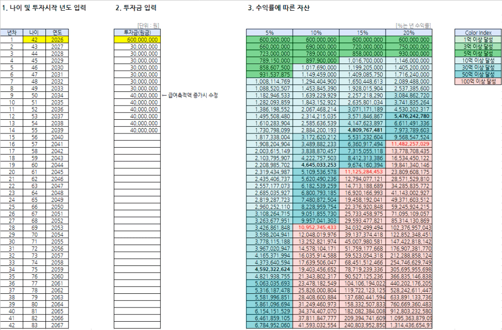 목표 금액 45.99억 (현재 나이 42세, 현재 목돈 + 연저축액 3000만원에서 시작)