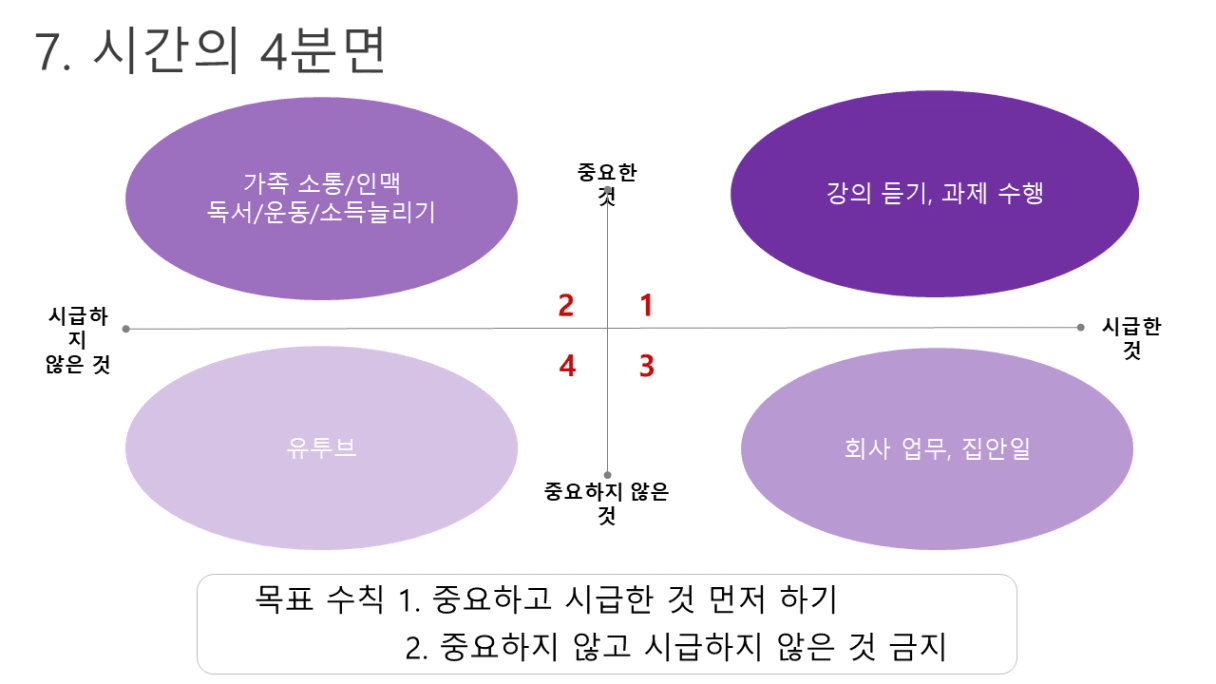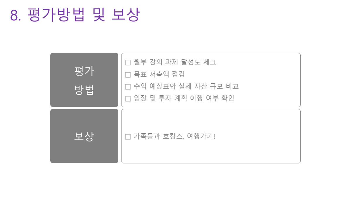 - 인간관계: 주1회 동료에게 안부 묻기, 월1회 가족들과 나들이