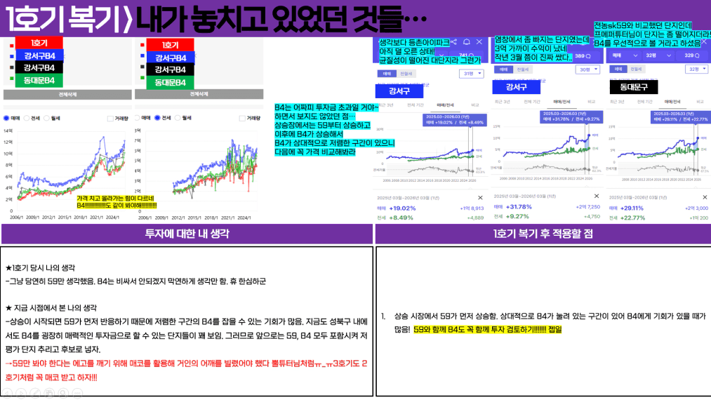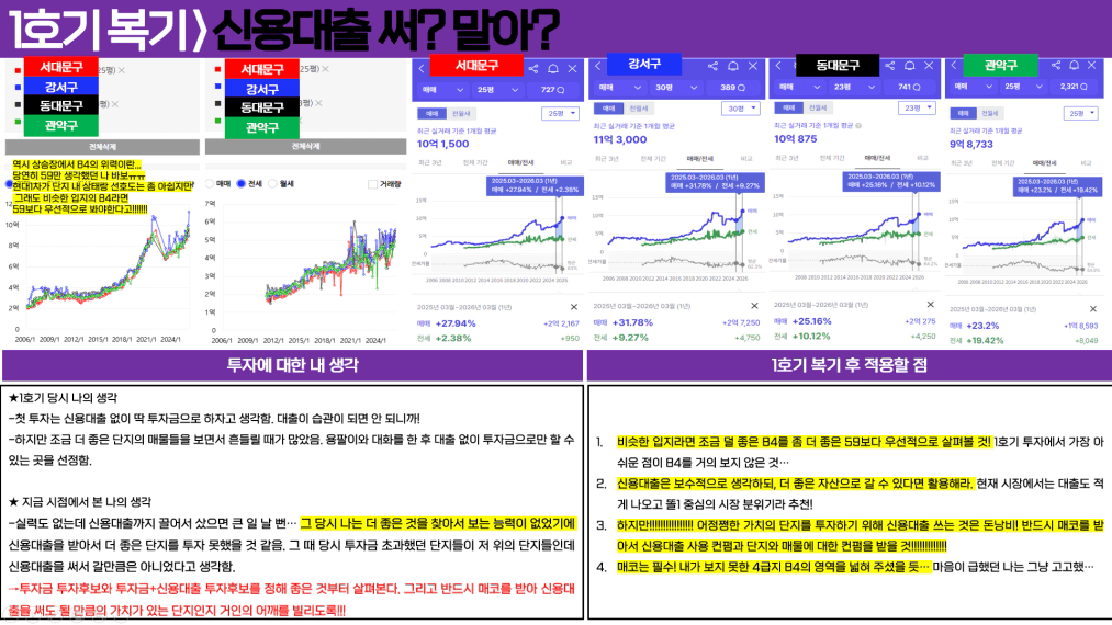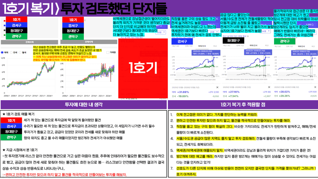 민경님~~ 복기 너무 좋네요. 고생 많으셨어요ㅎㅎ 투자 이후 앞마당이 늘어나면서 더 좋은 선택지도 보였을거고, 아쉬움도 있으시겠지만 가치있는 서울 자산을 싸게 취득하셨기에 잘하셨다고 생각합니다~!! 앞으로 더 좋은 투자하시기를 응원할게요❤️ 10억 달성 게시판에서 만나요😀