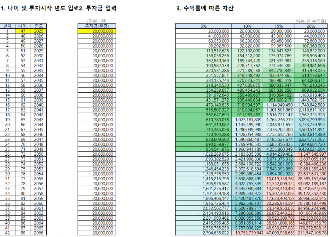 목표 금액 30억 7천 5백만원 (현재 나이 47세, 연 저축액 2000만원에서 시작)
