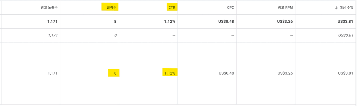 맞다.. 들어와서 광고 클릭률이 너무 낮았다. 1171 노출 중 8회라면 너무 아쉽다.