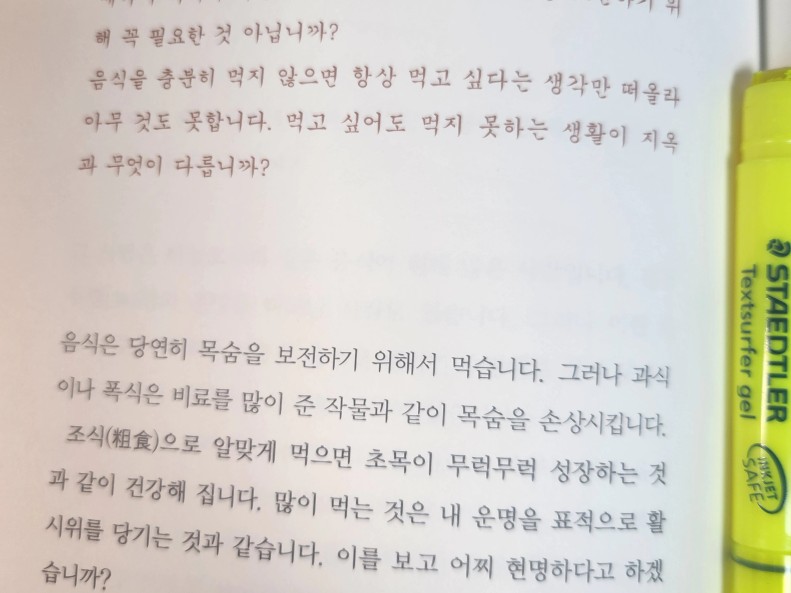 - p100. 충분히 먹고 싶다는 생각은 다 마음이 가난하기 때문에 생깁니다. 식량은 창고에 가득할 정도로 부자이지만, 마음이 간나해서 항상 먹고 싶다는 생각이 드는 것입니다. 하늘이 주신 천명을 알고 분수를 아는 사람들은 마음이 부자입니다. 스스로 절제하는 것이 천국의 길임을 아는 사람들은 오직 검소한 생활을 감사하고 행복해할 따름입니다.