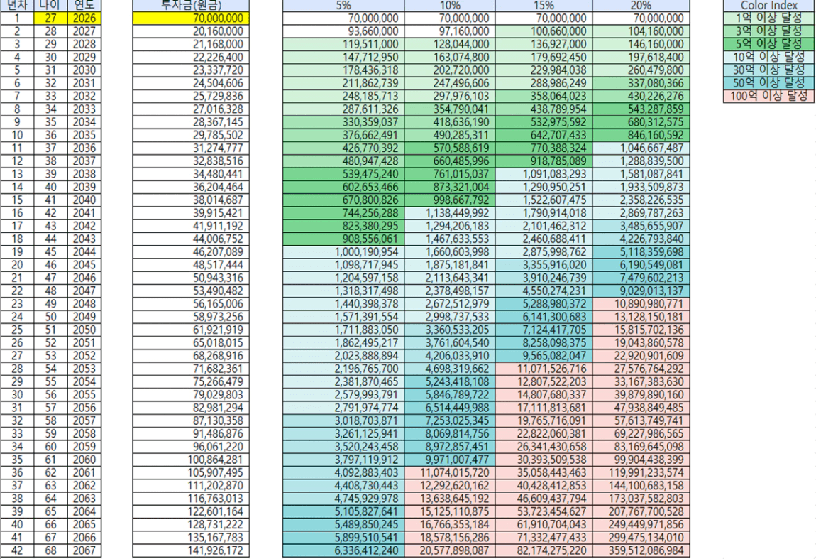 목표 금액 50억 (현재 나이 27세, 연저축액 1920만원에서 시작)