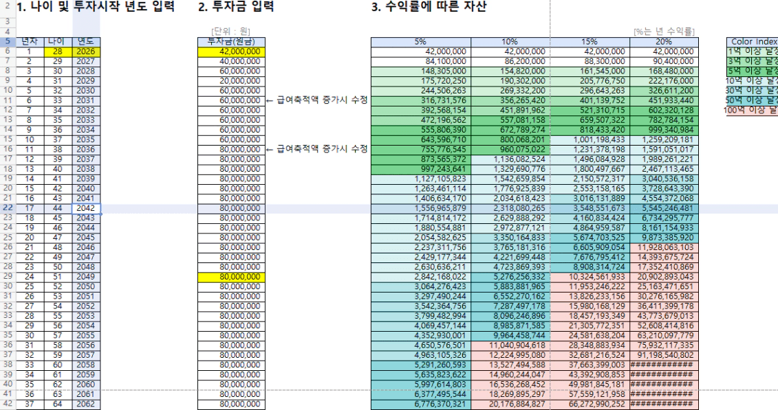 - 수익률 20%: 44세 (2042년)