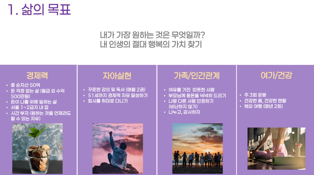 - 건강: 주 3회 필라테스/헬스, 휴가 다녀오기
