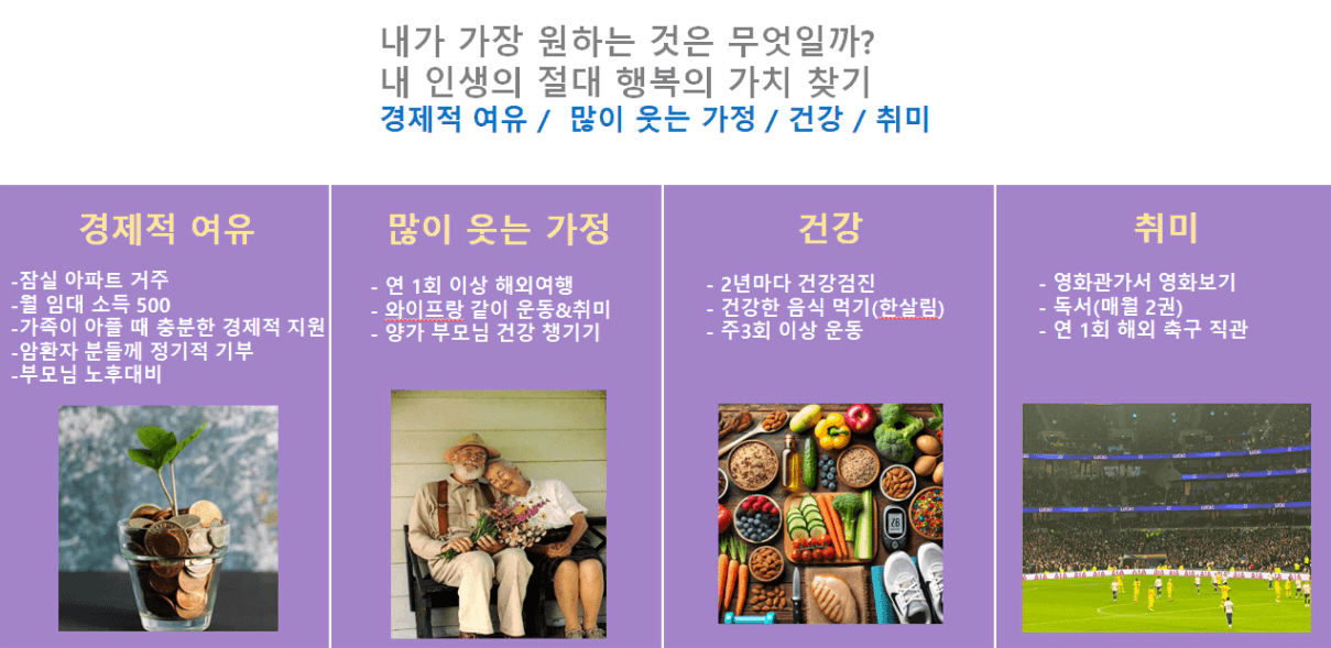 [내 인생의 행복 : 경제적여유 / 많이 웃는 가정 / 건강 / 취미]