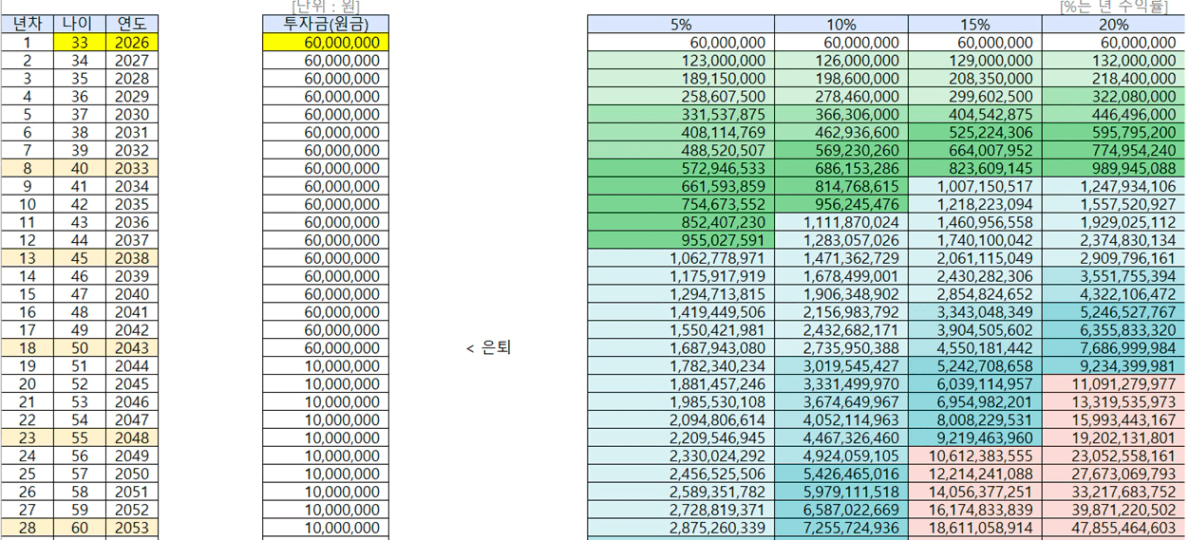 - 수익률 10%: 62세 (2049년)