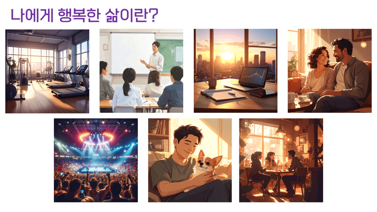 조장님께서 모든 조원분들의 비전 보드를 PPT로 준비해오셔서 다른 분들의 비전 보드를 함께 볼 수 있었다.(GOD부 조장님 감사합니다!) 다른 분들의 비전 보드와 그 설명을 들으며 하나의 큰 공통점을 발견했다. 단순히 “돈을 많이 갖고 싶다”가 아닌 “무언가 소중한 것을 지키기 위해서 부자가 되고 싶다"라는 메시지가 담겨 있었다. 그 소중한 것은 가족일 수도 있고, 삶의 여유일 수도 있고, 편안한 노후일 수도, ‘나 자신의 존엄’일 수도 있다. 중요한 것은 모두의 비전 보드가 단순히 ‘돈을 쌓는 것’에 그 의미가 있지 않다는 것이었다.