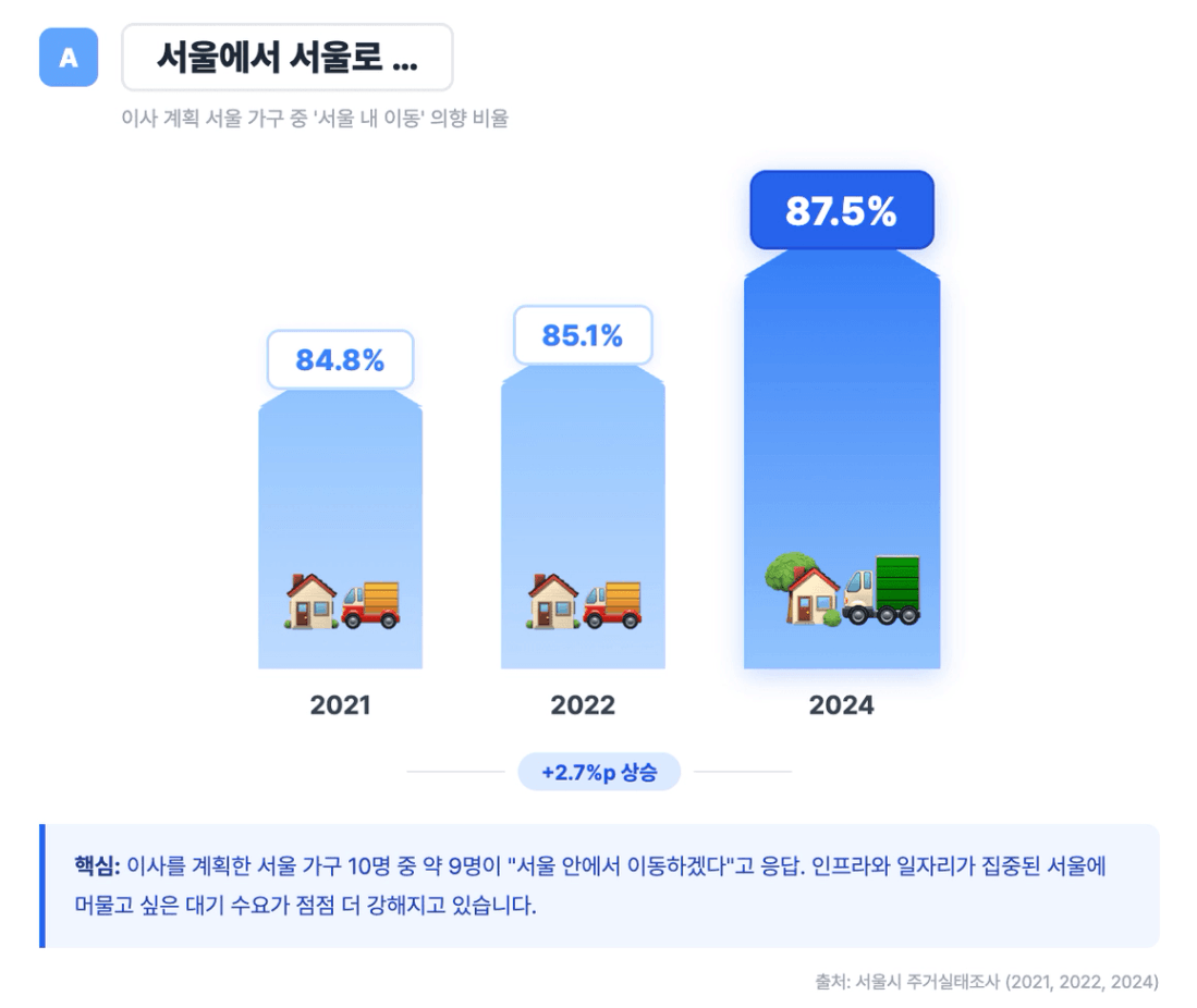 2025년 서울시 주거실태조사에 따르면, 이사를 계획한 서울 가구 중 87.5%가 ‘서울 안에서 이동하겠다’고 답했습니다. 경기도 신축이 아무리 좋아도, 결국 인프라와 일자리가 집중된 서울의 자장권 안에서 머물고 싶어 하는 대기 수요가 그만큼 견고하다는 방증입니다.