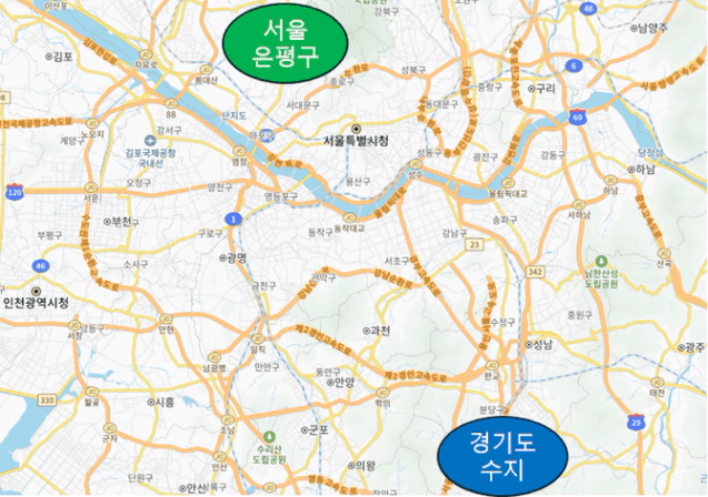 우선 위치를 살펴보면, 은평구는 서울의 동북권에 위치한 곳이고, 경기도 수지는 수도권 동남권에 위치해 있어요.