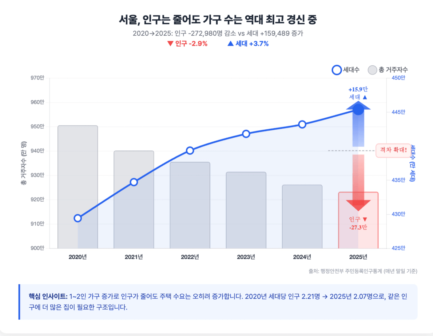 2020년 약 413만 가구였던 서울 가구 수는 꾸준히 늘어 2025년 현재 450만 가구를 돌파했습니다.