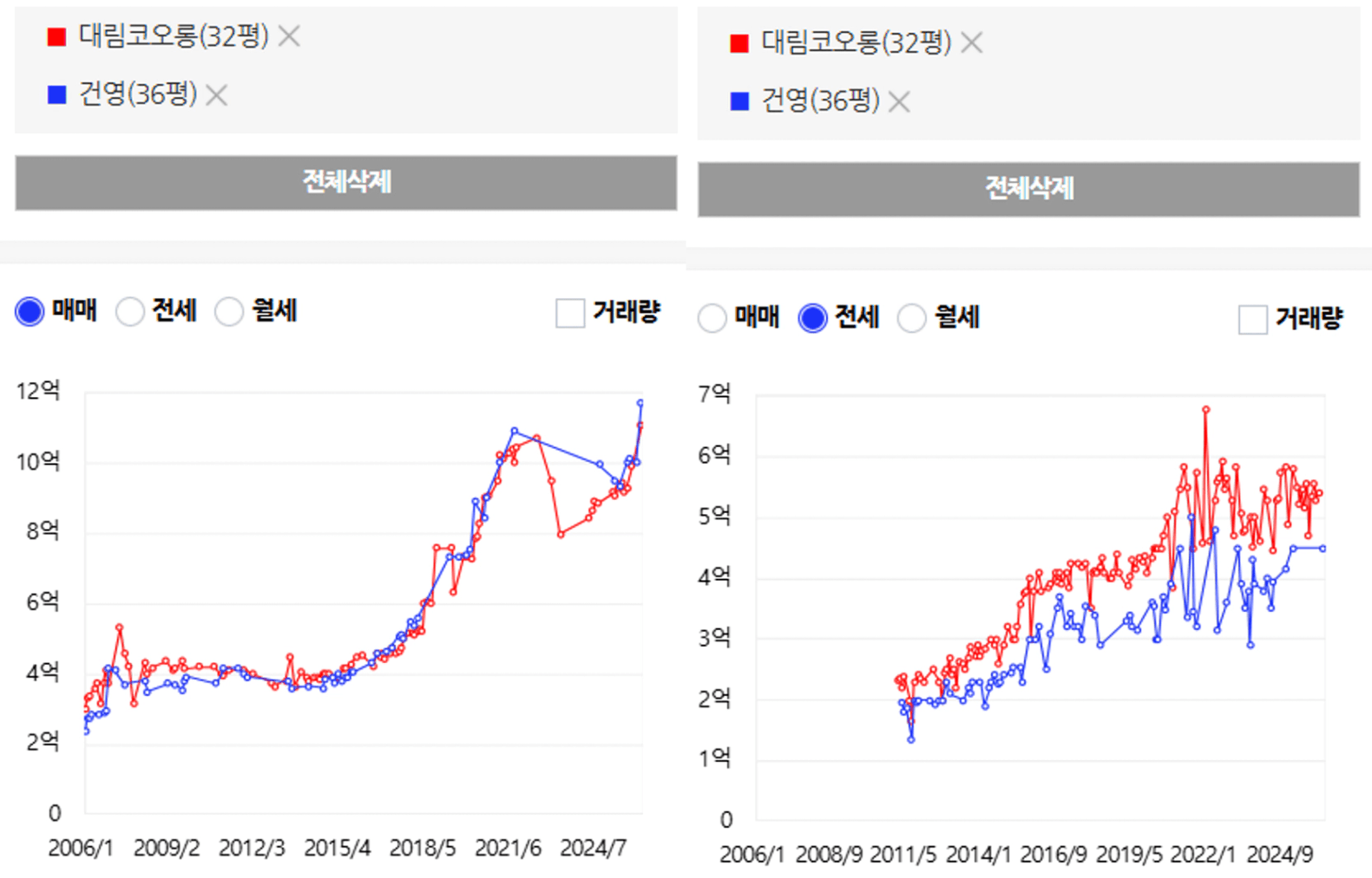 매매가는 비슷한데 전세가가 확연히 차이난다.