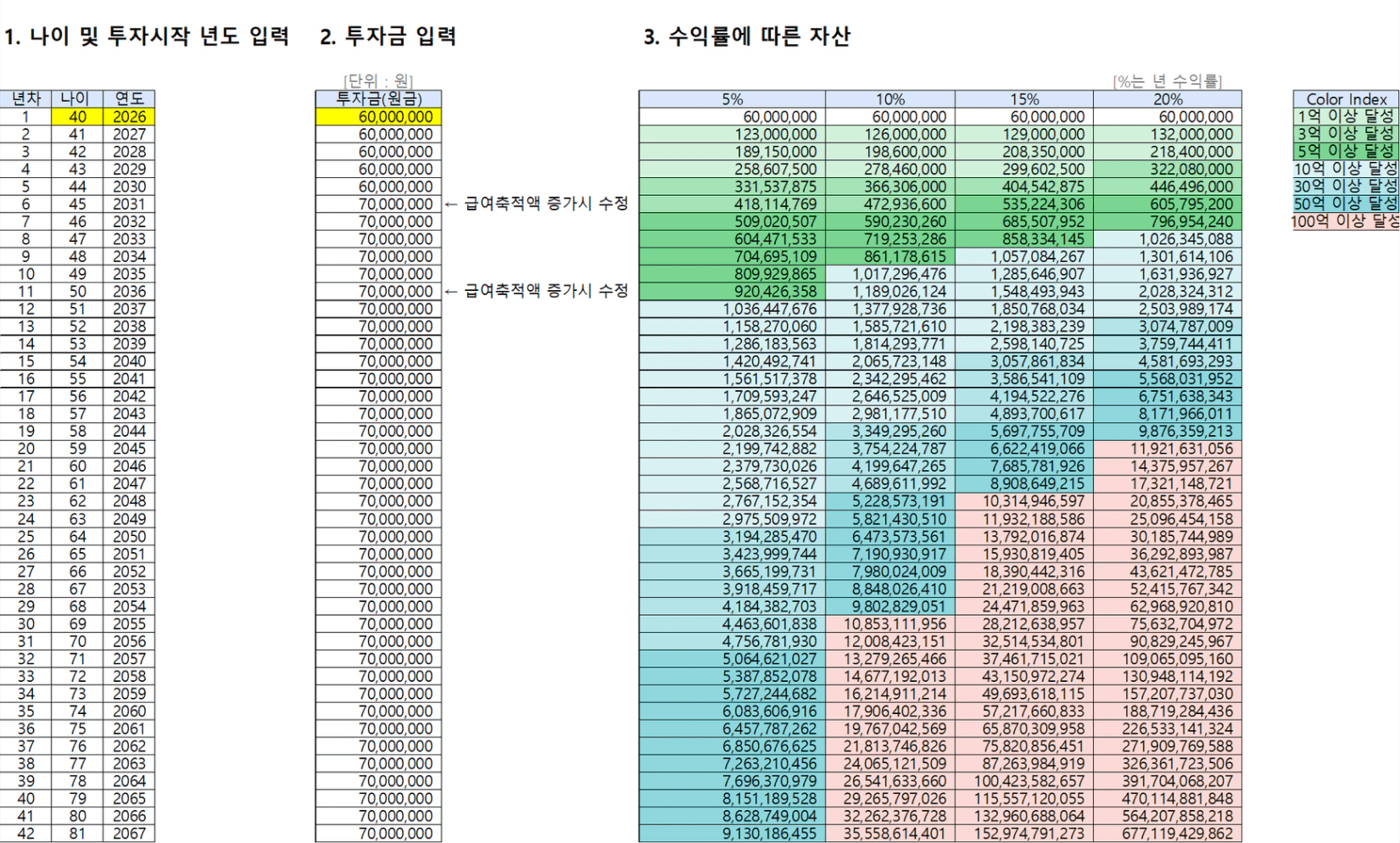 목표 금액 41.6억 (현재 나이 40세, 연저축액 6,000만원에서 시작)
