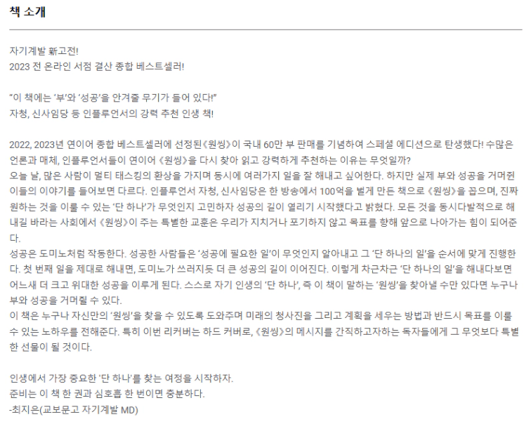 우리 삶에는 ‘단 하나’를 실행헤 옮기고 탁월한 성과를 올리는 데 필요한 간단한 공식이 있따. 공식에 필요한 세 가지 요소는 바로 목적의식, 우선순위 그리고 생산성이다. 이 세 요소의 연결을 통해 우리는 ‘단 하나’의 원칙을 두 개의 분야 적용할 수 있다. 그중 하나는 크고, 다른 하나는 작다. 당신이 가져야 할 ‘큰 단 하나’는 목적의식이고, ‘작은 단 하나’는 목적의식을 행동으로 옮길 때 필요한 우선순위다. … <크리스마스 캐롤> 목적의식을 갖고, 우선순위에 따라, 생산성을 위해 살아야 한다는 것이다. … 그(찰스 디킨스)는 우선순위가 곧 우리가 중요하게 생각하는 대상이고, 우리가 취하는 행동에서 나온다는 것을 알려 준다. 그리고 삶이란 일련의 연속된 선택이며 우리의 목적의식이 우선순위를 정하고, 우선순위가 행동의 생산성을 결정한다는 것을 일깨워준다. … 목적의식에 따라 사는 삶은 그 무엇보다도 강력하고 그 무엇보다도 행복하다.