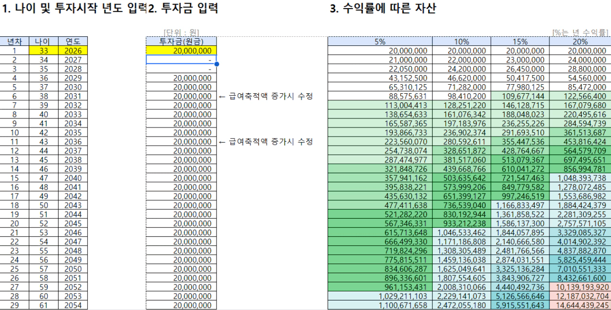 - 수익률 20%: 50세 (2041년)