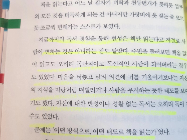 : 치열한 독서는 사람을 변화시킨다. 특정분야에서 성공한 사람들이 쓴 책에는 보통 30년의 노하우가 담겨 있어. 100권의 전문 분야 책을 읽으면 3,000년의 내공이 쌓이는 것과 마찬가지지. 책을 읽어도 어떻게 전개될지 감조차 잡지 못하던 지난날은 말 그대로 ‘과거사’에 불과했다. 어느 날은 책을 읽다 말고 뒷부분이 이미 다 아는 내용이라는 것을 확인하고는 희열감에 휩싸여 덩실덩실 춤이라도 추고 싶어질 때도 있었다. 책만 읽는다고 저절로 사람이 변하는것이 아니라는 점도 알았다. 자신에 대한 반성이나 성찰 없는 독서는 오히려 독이 될수도 있었다. 문제는 어떤 방식으로, 어떤 태도로 책을 읽는가였다. ‘나는 왜 책을 읽는가?’, ‘나는 책을 통해서 무엇을 변화시키고 싶은가?’ 책을 읽는 주체로서의 나를 잊지 않아야 한다.