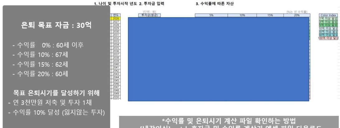 목표 금액 30억 (현재 나이 48세, 연저축액 3000만원에서 시작)