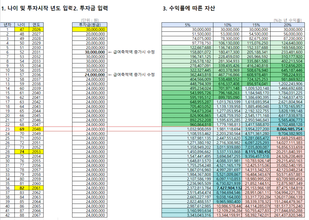 - 수익률 20%: 69세 (2048년)