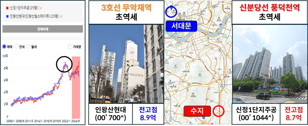 수지 내에서도 강남·판교 직장을 얼마나 편리하게 갈 수 있는가가 중요한 입지요소가 됩니다. 보통은 직주근접을 가진 단지의 경우 이미 올랐을 가능성이 있기에, 그런 단지를 쫓아가기보다 직장 접근성이 나쁘지 않고 수요가 꾸준한 지역 안에서 아직 전고점을 회복하지 못한 단지를 찾는 전략이 무주택자에게 훨씬 안정적인 선택이 될 수 있습니다.